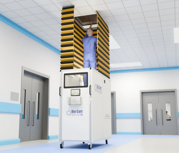 The Bio Cart HEPA 10 is 81cm wide x 185cm long and only 195cm high, easily fits through most doors and elevators, and the top expands up to 3 meters high to reach the majority of ceilings in commercial or industrial facilities.